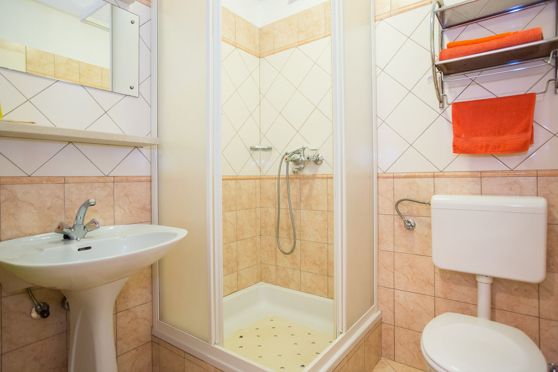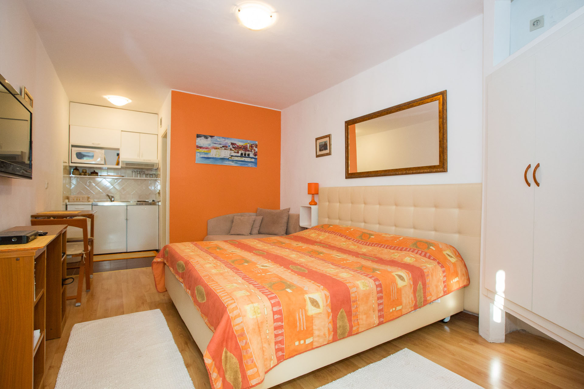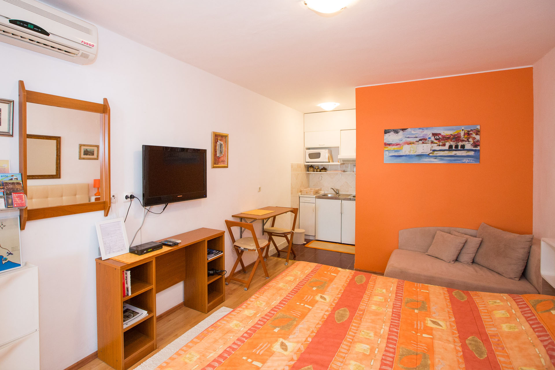 The suite has one large room that consists of one double bed, one single bed, with a kitchen area. The bathroom consists of a shower, basin and WC. Studio apartment No.1, finished in warm terracotta colours, is suitable for 2-3 persons. It is air conditioned (cooling & heating), equipped with SAT/TV. and traditional stone barbecue, with sea views from the terrace.