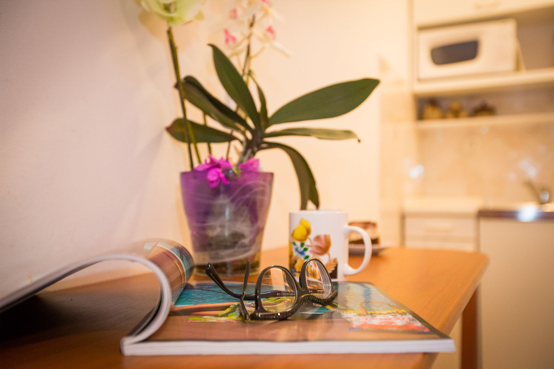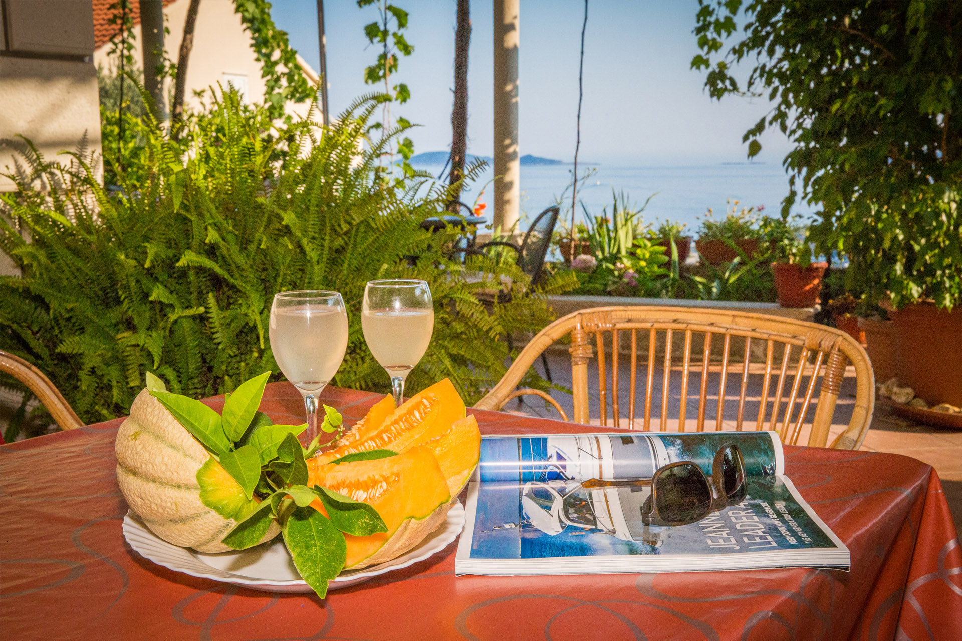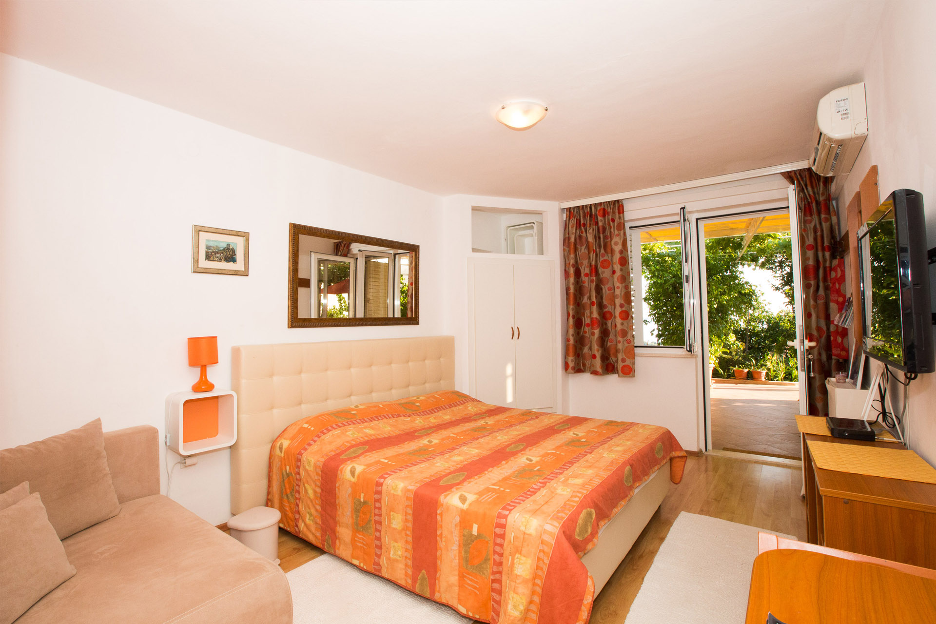 The suite has one large room that consists of one double bed, one single bed, with a kitchen area. The bathroom consists of a shower, basin and WC. Studio apartment No.1, finished in warm terracotta colours, is suitable for 2-3 persons. It is air conditioned (cooling & heating), equipped with SAT/TV. and traditional stone barbecue, with sea views from the terrace.